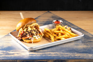 beef, bacon, and BBQ brisket topped with American cheese, chipotle mayo, lettuce, tomato, red onion, pickles and hand-battered onion strings on a pretzel bun