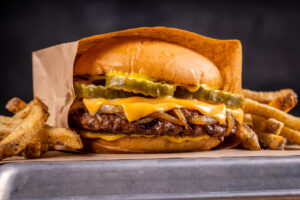 thinly smashed 1/4lb burger with caramelized onion, American cheese, pickles, and mustard on a potato bun