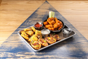 choose any three: mozzarella bites, southwest egg rolls, loaded potato skins, fried pickles, jalapeño chips, and boneless wings