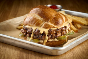 two thinly smashed burger patties, beer cheese sauce, mustard, and pickles, served on a pretzel bun