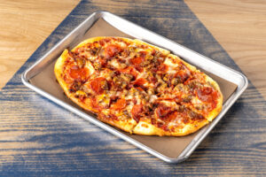 pepperoni, sausage, bacon, marinara, and mozzarella, topped with parmesan cheese