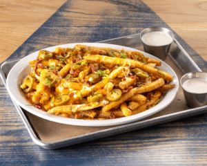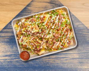 crispy tortilla chips topped with house-made queso, lettuce, pico de gallo, cilantro, jalapeños, sour cream, BBQ sauce, and smoked brisket