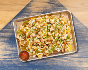 crispy tortilla chips topped with fajita chicken, house-made queso, lettuce, pico de gallo, cilantro, jalapeños, and sour cream