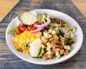 grilled chicken served chilled, avocado, mixed cheese, cherry tomato, bacon, bleu cheese crumbles, hard-boiled egg, red onion, served with a side of avocado ranch
