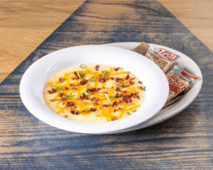 cheddar and jack cheese, bacon, green onion, and jalapeños