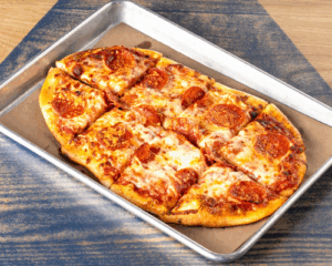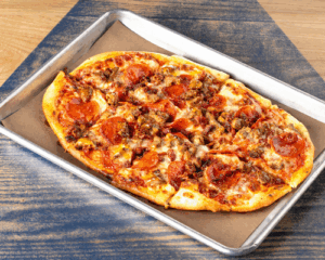 pepperoni, sausage, marinara, and mozzarella, topped with parmesan cheese
