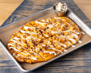 grilled chicken, parmesan, mozzarella and buffalo sauce drizzled with house-made ranch and served with a side of blue cheese crumbles