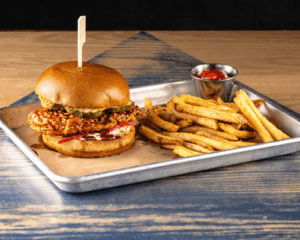 hand-battered chicken breast tossed in Nashville hot sauce with chipotle mayo, sweet slaw, onions and pickles