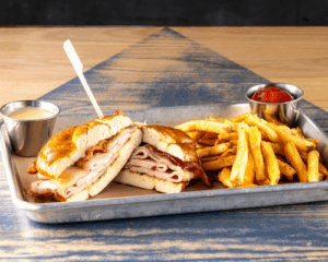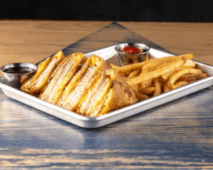 turkey, ham, swiss and american cheese sandwich, tempura battered and fried, topped with powered sugar and served with a side of preserves