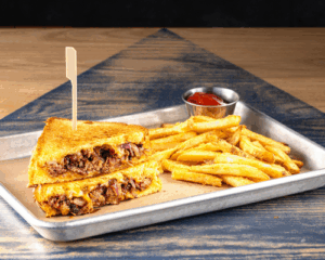 smoked brisket, BBQ sauce, grilled red onions, melted jack and cheddar cheese, on toasted brioche bread