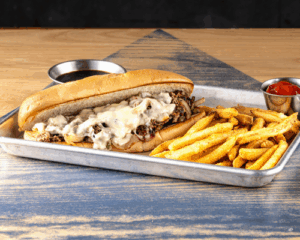 thinly sliced steak, roasted bell peppers, onions, provolone cheese on a hoagie roll with a side of au jus