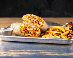 hand-battered buffalo chicken, roma tomato, mixed cheese, shredded lettuce, in a warm flour tortilla, served with house-made ranch