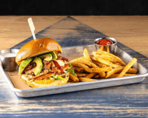 grilled chicken breast, applewood-smoked bacon, swiss cheese, lettuce, tomato, red onions, pickles, and avocado, on a bun served with a side of house-made ranch