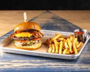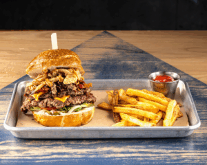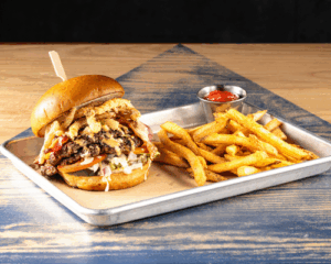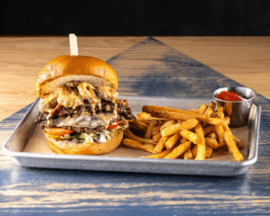 two thinly smashed burger patties, roasted poblano pepper, pepper jack cheese, ghost pepper sauce, black pepper mayo, jalapeño relish, lettuce, tomato, red onion and pickles