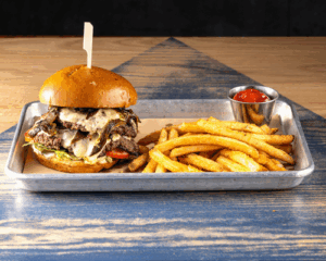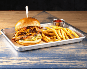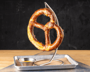 beef, bacon, and BBQ brisket topped with american cheese, chipotle sauce, lettuce, tomato, red onion, pickles and hand-battered onion strings on a pretzel bun