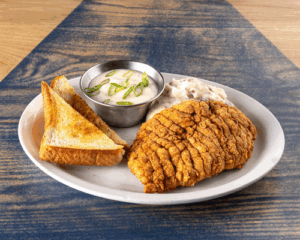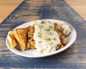 hand-battered chicken breast and mashed potatoes, served with black pepper gravy and green onion, and served with Texas toast