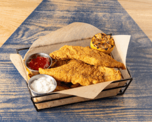 cornmeal-battered catfish with grilled lemon and tartar sauce, served with fries
