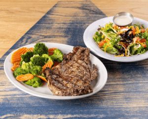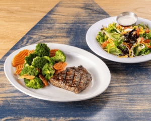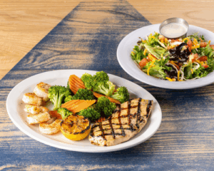 lemon pepper chicken and grilled shrimp, served with steamed vegetables and a side salad