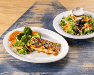 6 oz Norwegian salmon fillet with teriyaki sauce, served with steamed vegetables and a side salad