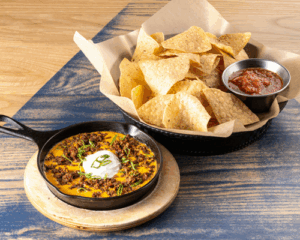 topped with ground beef, sour cream and green onion, served with crispy tortilla chips
